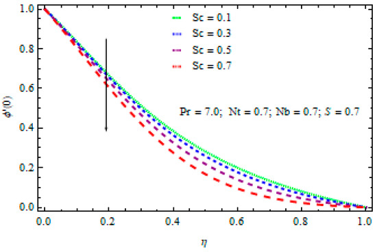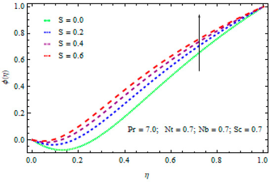 The temperature values drop with the rise in factor S as depicted in Figure 13. The heat flow from sheet to fluid reduces with the rise in S and results in a cooling effect. The collisions between fluid molecules are delayed to a small extent. Figure 14 shows a rise in the concentration profile. This is an impact of the rise in the momentum boundary layer resulting from the rise in the unsteadiness parameter S.