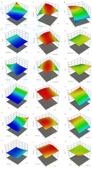 The degree of esterification of pectin, which is an important parameter for its applications in the industry, is related to the technological characteristics of the solubility of pectin, the emulsification capabilities, and the ability of the polysaccharide to form gels [43,44]. Table 2 shows the experimental DE, alongside the predicted values, and Table 3 the ANOVA results for this parameter. The interactions between sonication amplitude, pH, SLR and time that determine the evolution of the DE of pectin are shown in Table 3 and Figure 1M–R.According to the data presented in Table 2, all samples had a DE above 50%, ranging from 60.34% (run no. 10, 20% amplitude, pH of 1.5, 1:15g/mL SLR and 20 min extraction time)to 94.75% (run no. 26, 60% amplitude, pH of 2.5, 1:10 SLR g/mL and 20 min) and were classified as pectin with high esterification degree.
