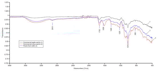 The sample extracted by UAE in optimal conditions and the commercial pectin samples were subjected to FT-IR analysis using a Spectrum Two infrared spectrophotometer (PerkinElmer, Waltham, MA, USA). The characteristic spectra were recorded (three scans for each sample) in the frequency range of 4000–400 cm−1 at a resolution of 4 cm−1 [22]. Spekwin32–optical spectroscopy software (Version 1.72.2) was used to display the spectra.