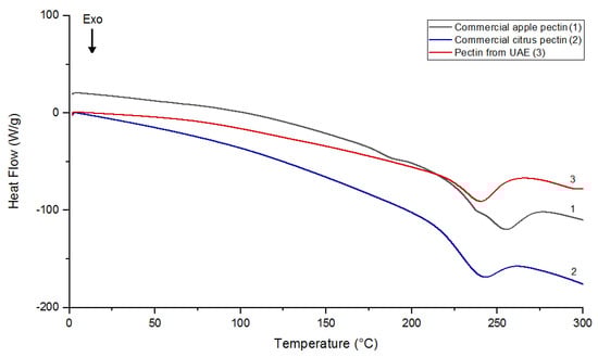 Thermal analysis of the pectin samples (pectin extracted by UAE in optimal conditions, commercial apple pectin, and citrus pectin) was carried out in triplicate with the differential scanning calorimetry technique (DSC). DSC measurements of dried pectin (5 mg), weighted in aluminum pan and placed in the instrument (DSC 8500, PerkinElmer, Waltham, MA, USA) together with an empty pan used as reference, were performed over a temperature range of 0–300 °C at a heating rate of 10 °C/min in dynamic inert nitrogen atmosphere (flow rate of 20 mL/min).