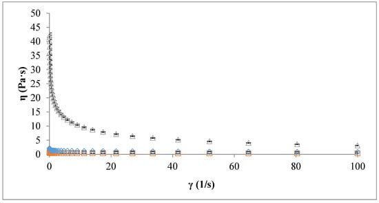 Figure 4 presents the flow curves of the three pectin samples; all curves present a shear thinning behaviour of a non-Newtonian fluid due to the weakness of the pectin intermolecular forces with increasing shear rate [55,56]. It can be observed that the origin of pectin had no influence on the thinning behaviour of the solutions, as all of them had the same behaviour, showing viscosity decrease with the increasing of shear rate. Regarding the dynamic viscosity, it was observed that the UAE sample had a higher viscosity than the commercial pectin solutions, which implies that different extraction conditions and raw materials influence the flow behaviour of pectin solutions [56]. The viscosity of UAE pectin at a shear rate of 1 s−1 was 21.07 Pa·s and was higher than in the case of commercial citrus pectin (1.35 Pa·s) and commercial apple pectin (0.39 Pa·s); this value was also higher than the viscosity measured in the case of gabrioba pectin in the same conditions (approx. 0.2 Pa·s) [57] and viscosity obtained for 5% pectin solutions of cacao pod husks [58] and apple pomace [59], which was lower than 0.2 Pa·s.
