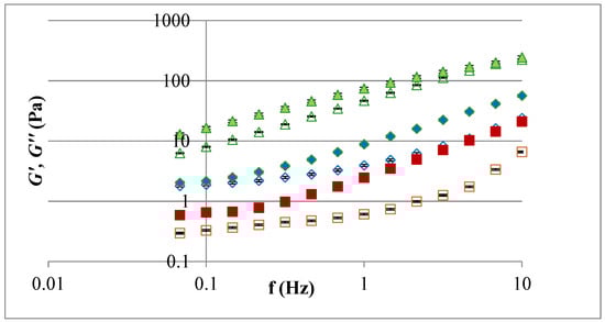 ); G′—elastic modulus, G″—loss modulus, f—frequency.