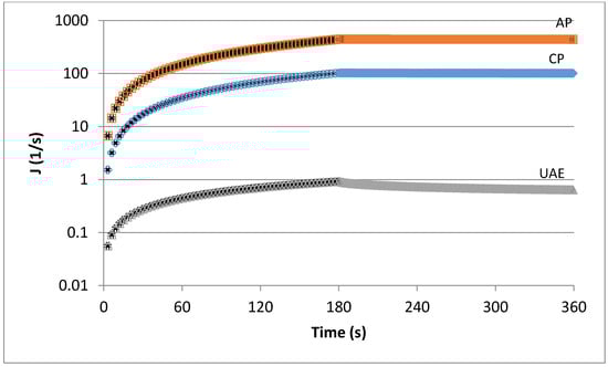 The creep test (Figure 6) represents a graphical representation of the compliance in function of time. The creep analysis is from 0 to 180 s, while the recovery analysis is from 180 s to 360 s.