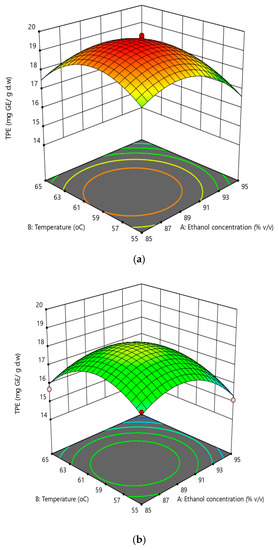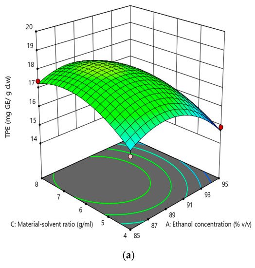 Figure 10 presents the response surface plot which gave the extraction yield of TPC as a function of material:solvent ratio and ethanol concentration. Different plots according to fixed temperatures (55 °C, 60 °C, and 65 °C) are illustrated. It was indicated that the extraction yield of TPC increased analogously with the material:solvent ratio and ethanol concentration. However, as the ethanol concentration began surpassing 90% (v/v), TPC started to decline. Of the three subplots, the plot of extraction temperature of 60 °C had a calculated TPC peak at 19.7 mg GE/g d.w.