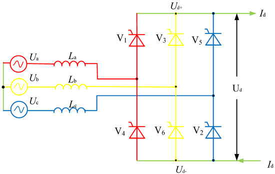 where the rectifier is linked to the AC grid by the equivalent resistance R1 and inductance L1, respectively, C1 represents the capacitance of DC bus, and . denotes the DC current that flows out of the rectifier.