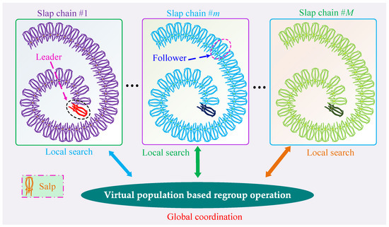 For the purpose of enhancing the stability of convergence, the virtual population need to be rearranged and generate various new salp chains based on the fitness values of the salps. In particular, the regroup operation of the original population in MSSA is achieved according to the classical memetic algorithm called shuffled frog leaping algorithm (SFLA) [25], which is a widely utilized population partition principle. Therefore, through arranging the fitness value in descending order the maximum optimization of regroup operation can be realized. Here, the best solution is allocated to the salp chain #1, then the salp chain #2 will capture the second-best solution, and so on. Hence, the mth salp chain can update the swarm according to