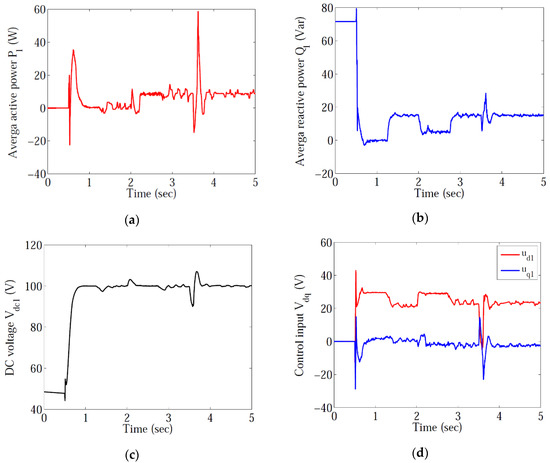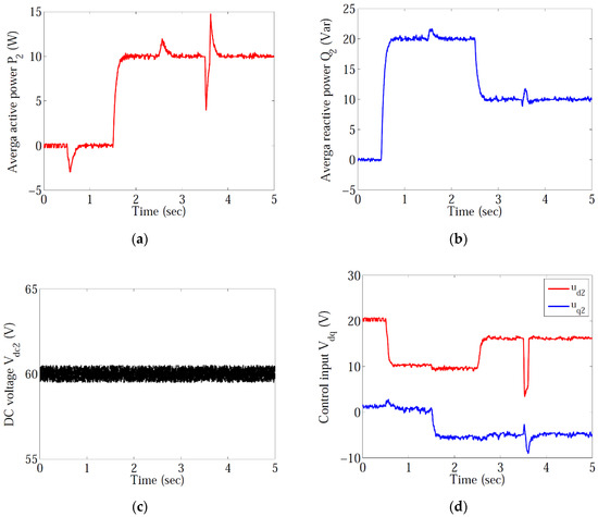 System responses obtained in the inverter controller experiment. (a) Average active power ; (b) average active power ; (c) DC voltage ; (d) control input .