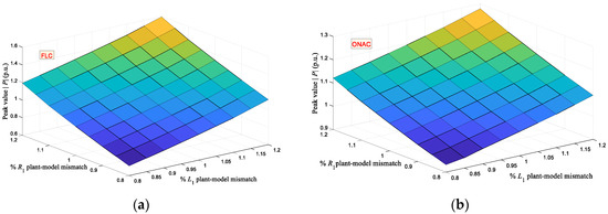 Peak value of active power |P| obtained under a 50% voltage drop lasting 100 ms at VSC with 20% variation of the equivalent resistance R1 and inductance L1 of FLC and ONAC. (a) FLC and (b) ONAC.