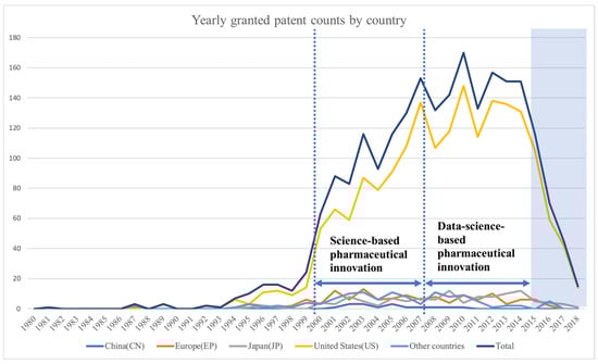 In this study, the authors used patents from the popular triadic patent family of the United States, Europe, and Japan as the analysis sample []. Even for this popular triadic patent family, pharmaceutical-granted patent rate was low. The granted patent rate was 27.0%; thus, even the granted patent rate for the US did not exceed 50%. To avoid presenting results that contained insignificant information, disqualified patents were excluded. Thus, this study used only granted patent data. Finally, to reflect the characteristics of recent technology, the author restricted the sampling period.