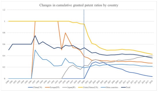 As shown in Figure 2, dramatic changes in the cumulative granted patent ratio can be easily identified by country. Since 2000, each country has shown different behaviors in cumulative granted patent ratio. The cumulative granted patent ratio in the US has decreased significantly. This may have resulted due to the rapidly increased activities in patent application. From 1975 to 1999, the cumulative granted patent count was 30. Subsequently, the US granted 31 patents in the following years. This could signal the change in the technological regime, from the active implementation of the innovation model, to a science-based pharmaceutical innovation. Thus, the focus of innovation activities progressed to the still developing science-based pharmaceutical innovations.