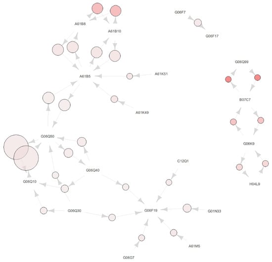 Broadly, the IPC codes are divided into two group in Figure 4. The majority of IPC codes starting with A61 are linked with the A61B5 cluster and the majority of IPC codes starting with G06 are linked with the G06F19 cluster. In particular, there are intermediate IPC codes between A61B5 and G06F19, that is, A61K38 and A61M5.
