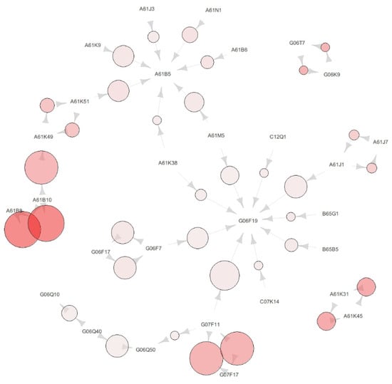 The direct relationship of A61B5 and G06F19 has changed. The lift value of A61B5 and G06F19 has decreased, and the difference was 0.354. This implied that the independent development of technology A61B5 and G06F19 occurred less frequently in the science-based innovation period than in the data science-based innovation period. Moreover, as described in Section 4.2, the precedence for development has been established. Thus, it may be implied that the relationship of technology has become more strict and concrete owing to the accumulation of technological development.