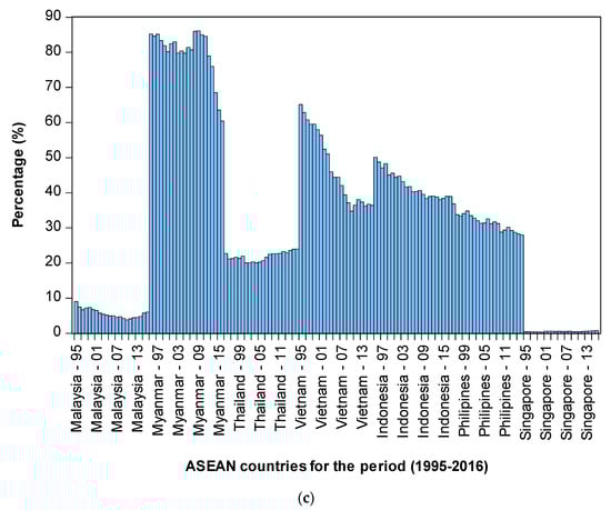 Historically, the consumption and reliance on fossil fuels in ASEAN countries have been generally on the rise [13]. ASEAN countries are experiencing the world’s most significant jump and are considered as regions vulnerable to causing climate change [14]. Every decade, since 1960, the average temperature in the Southeast Asian region has risen, which has adversely added to climate change. The economic progress of five of the ASEAN countries: Malaysia, Indonesia, the Philippines, Singapore, and Thailand, is commendable compared to the other two [4]. Nevertheless, Vietnam and Myanmar have shown the highest renewable energy production among the other regional counties. As such, these two developing economies of ASEAN, for renewable energy initiatives, were also included in this study. It is pertinent to mention that 57% of the total electricity production in Myanmar has been based on its indigenous hydropower resources, thereby tackling, effectively, the emission of greenhouse gases [15]. Moreover, Myanmar, together with Vietnam, has also focused on implementing the climate-resilient de-carbonization pathways, thus assuring its significance in the renewable energy market. It is estimated that Myanmar can further install electricity plants of 104,000 MW capacity based on the wind and hydropower plants and that it can produce another 40 TWh/year (TWh/year stands for terawatt-hour per year) from solar power plants [16]. As per a World Bank Database report (2016), Singapore (98%), the Philippines (46%), Thailand (42%), and Cambodia (33%) were the four major energy-importing ASEAN countries [17]. Meanwhile, other countries like Brunei, Indonesia, Myanmar, and Vietnam are well-known energy resource exporters. In most of the ASEAN countries, renewable energy resources are abundant and are sufficiently consumed, such as in Indonesia, Malaysia, Thailand, and Vietnam [18]. As such, these countries with the further harnessing of renewable energy resources can significantly reduce greenhouse gas emissions. On the other hand, Singapore being a highly urbanized and energy-intensive nation (Figure 1a), aims at reducing its emissions by 7%–11% by 2020 using urban renewable energy applications [19]. The environmental quality in many large ASEAN cities has also considerably declined, which is alarming, and thus requires the development of appropriate energy strategies.