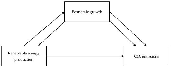 It is an essential and well-realized fact that an effective economic policy formulation requires a better understanding of various interconnections in the economy, including the nexus among renewable energy production (dependent variable), CO2 emissions, and economic growth. The empirical model representing the long-run relationships among these interconnections as variables is given in Equation (1) as follows: