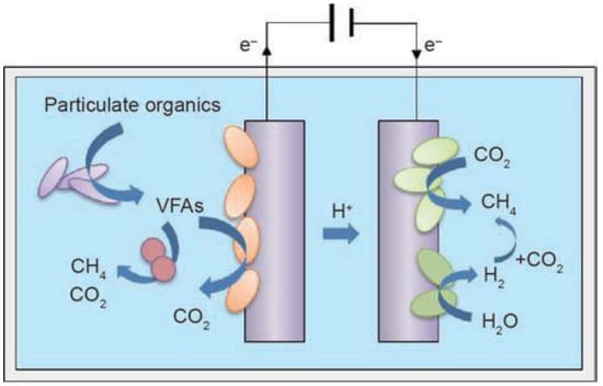 An illustration of bacterial interaction through the integrating effect of an MES and an anaerobic digestion process (VFAs: volatile fatty acids). Reproduced with permission [105].