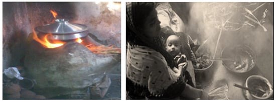 Rural people in Bangladesh constitute 76% of the population and regularly use a mud-built cylinder stove (placed on three raised plinths and situated above or below ground level) for cooking and heating purposes—refer to Figure 1 [13]. An opening between these plinths provides a convenient fuel-feeding port, whilst conversely, the remaining two openings provide flue gas exit ports. This mode of biomass cooking within domestic properties creates a significant volume of indoor air pollution and represents a major public health hazard for occupants [14]. This is because, traditional biomass fuels generate more pollution than comparatively cleaner alternatives, such as kerosene or biogas. The cumulative impact of burning biomass upon both the general public and environment dictates that new and/or alternative sources of energy production are urgently required in Bangladesh.