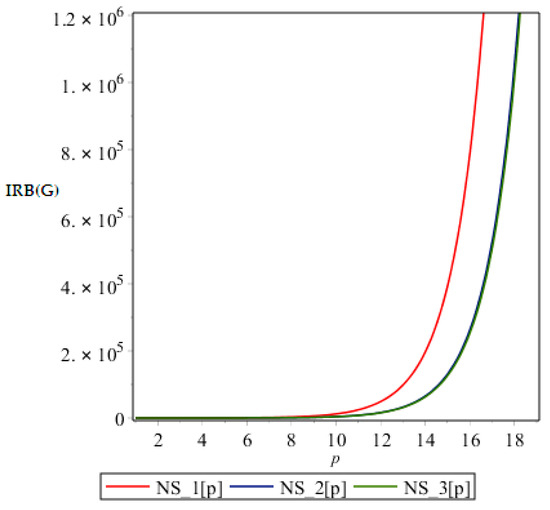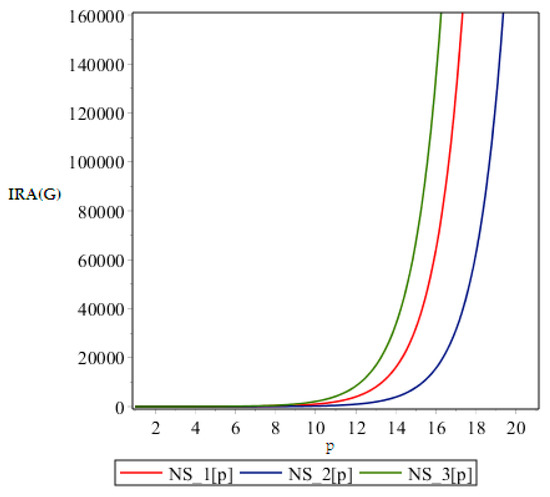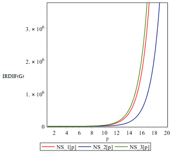 All above graphs (Figure 4, Figure 5, Figure 6 and Figure 7) indicate that NS3[p] is highly asymmetric as far as all irregularity indices are concerned, whereas NS1[p] is less asymmetric, and NS2[p] is the most regular structure with respect to all indices. In , NS1[p] and NS3[p] show the same irregularity behavior. These facts typically relate geometry and topology of the structure of these dendrimers and can be used in modelling purposes.