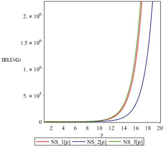 In this part we give our comparative analysis of some of the irregularity indices of the above discussed dendrimers and the dependences of the irregularity indices on the parameter of the structures. Figure 4, Figure 5, Figure 6 and Figure 7 contain three graphs of irregularity indices. The horizontal axis is used for step size p and the vertical axis shows the value of irregularity index. In the graphs, the red color shows the irregularity of NS1 [p], the blue color shows the irregularity of NS2 [p] and the green color shows the irregularity of the NS3 [p]. In each graph, three different colored curves are depicted which shows the behavior of the irregularity indices with increase in p.