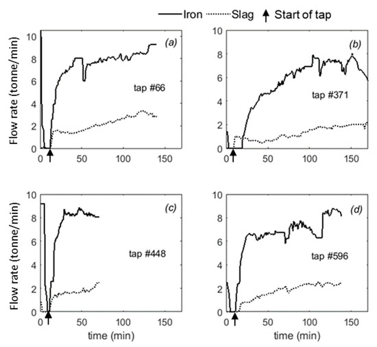 Examples of liquid outflow patterns from the Data set 2: (a) zero slag delay and 135 min tap duration, (b) negative slag delay and 170 min tap duration, (c) zero slag delay and 70 min tap duration, and (d) positive slag delay and 140 min tap duration.