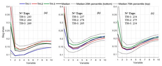 A preliminary study of the normalized outflow patterns showed differences between data sets and tapholes. Figure 4 shows the slag share for the 10 average points or variables of the data sets after preprocessing. Data set 1 is presented in Figure 4a, while Data set 2 is presented for comparison in two equivalent consecutive subsets of 720 and 763 taps in Figure 4b,c, respectively. The median curves for each taphole are depicted, as well as the median for the whole data set or subset and their corresponding 25th and 75th percentiles. The median for TH-1 in Data set 1 is seen to be similar to the 25th percentile of this dataset, while for TH-2, it is similar to the 75th percentile, particularly for variables 1 and 8–10. The median of TH-3 is, on the other hand, comparable to the global median. The median for the first subset of Data set 2 shows higher slag shares for all variables compared with Data Set 1, particularly for variable 1, where the median of TH-1 falls below the global median, while median of TH-2 falls above, and for TH-3 at the same level. Taphole median values are found above and below the global median in different orders for the other nine variables. In the second subset of Data set 2 (cf. Figure 4c), variable 1 shows a decrease from 0.35 to 0.23, with TH-1 and TH-2 medians below the global median and TH-3 above. Similar median curves are observed for variables 2–10 as in the first subset in Figure 4b.