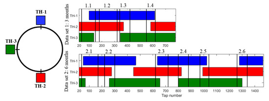 The method as a batch algorithm organizes all samples in the component dimensions regardless of the taphole operated. In order to process the results, moving averages of the selected principal components for the latest 20 taps (corresponding to approximately two days of operation) were considered. The average was calculated for each taphole, taking into account the taps that occurred within the latest 20-tap window. Thus, this post-processing criterion yields a quasi-time evolution. It is important to stress that the main objective of the work is to reveal similar or different behavior of the drainage from the different tapholes to gain understanding of the variability seen during operation. The left panel of Figure 6 shows a lay-out of the three tapholes in the furnace. The right top and bottom panels present the periods during which the tapholes were operated in Data set 1 and Data set 2, respectively. Each taphole is typically operated about three weeks for the blast furnace in question. This schedule results in the alternating operation of two tapholes at the time, with some overlap (where all three tapholes are used) during the transition periods. The figure also indicates the (numbered) periods that are analyzed in the following subsections.