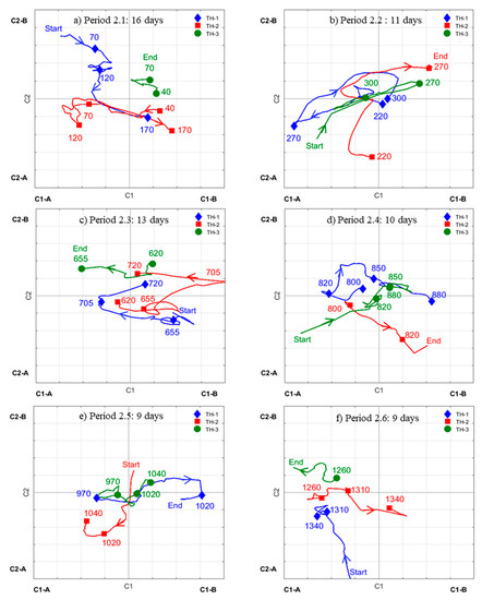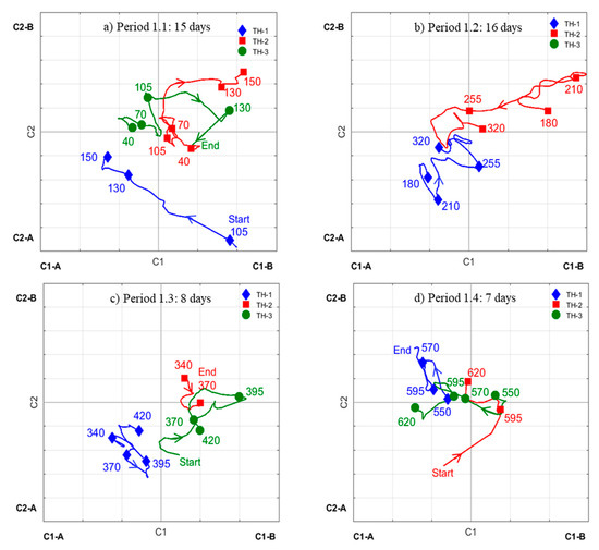 It should be noted that the representation, because of the data compression and averaging, does not provide detailed information about single days of operation. However, the comparison between tapholes at any given point could indicate agreement or disagreement between the outflow patterns. We will present some snapshots (cf. Figure 7, Figure 8, Figure 9 and Figure 10) of the motion of the averages of the principal components as time evolves. The corresponding components of the tapholes are depicted by blue line and diamonds (TH-1), red line and squares (TH-2), and green line and circles (TH-3). For the sake of clarity, the two most important components (C1 and C2) are plotted versus each other in a “phase plot” for shorter sub-periods (cf. Figure 7 and Figure 9).