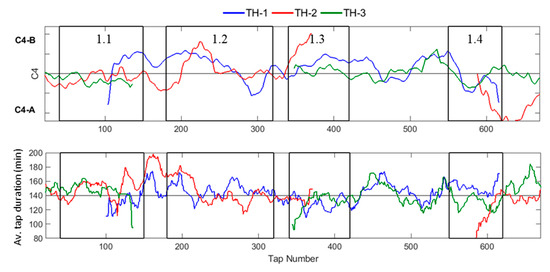 Figure 8, in turn, shows that C4 values higher than the mean occur when the tap duration is short. As seen in Figure 5, high C4 values correspond to a negative slope of slag share. Thus, if the slag share is high at the beginning of the tapping and, as a consequence, the descent of the slag–gas interface is rapid, a short tap duration can be expected because the moment when the slag–gas interface bends down to the taphole will end the tap [9] (cf. Figure 1). This holds true for TH-1 and TH-2 beyond Period 1.1.