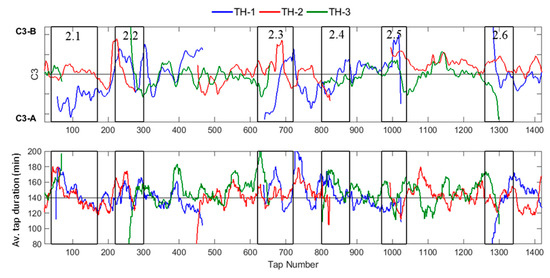 Third principal component (C3, top) and average tap duration (bottom) corresponding to the six periods of Data set 2. Blue line (TH-1), red line (TH-2), and green line (TH-3).