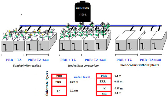 In this regard, the use of waste or local substrates to fill the cells subsurface-flow CWs, and the use of ornamental vegetation which is not typical of natural wetlands, but has physiological characteristics that could adapt to CWs and also generate an aesthetic landscape to produce flowers was investigated. In order to know the best design of CWs, and intensify the removal of pollutants by using ornamental plants with flower production, and different substrates, the main aim of this study was to evaluate the effect of removing pollutants from the community wastewater by using different layers of substrates (porous river rock PRR) + tepezil (TZ) vs. PRR + TZ + soil), and different ornamental vegetation (Spathiphyllum wallisii and Hedychium coronarium) in subsurface-flow CW mesocosms.