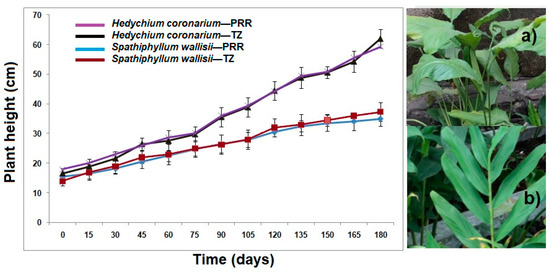 Vegetation growth in study. (a) Spathiphyllum wallisii, and (b) Hedychium coronarium.