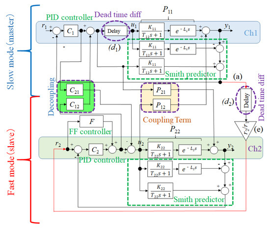 For simplicity, the proposed SMBC control method was applied to a simplified multi-point temperature control system with two inputs and two outputs. The block diagram is shown in Figure 2, where r and y indicate the reference and the output temperatures respectively. The subscripts 1 (Ch1: channel 1) and 2 (Ch2: channel 2) refer to the slow mode and the fast mode, respectively. The steady-state gain, time constant, and dead time of the plant are expressed by K, T, and L respectively. The proposed SMBC structure can be divided into seven blocks.