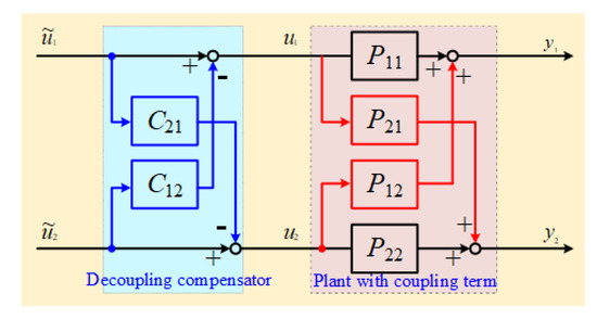 The coupling influence affects the temperature of two points; thus, decoupling compensation was introduced into the system to reduce the influence of the coupling term between the two points. The structure of the decoupling compensation is shown in Figure 6, where the C and C are the decoupling compensators. The decoupling compensators were designed as (2) and (3), respectively. In this proposal, the decoupling compensators consider the transient response between the two points using only the high-frequency gains.