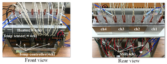 In this proposal, to precisely verify the control efficiency of the SMBC method, the controlled object was based on a real plant system; thus, a step response experiment needed to be performed to obtain the transfer function of the controlled objects. Figure 9 shows the experimental setup for the multi-point temperature control system with strong coupling effect, which use a DSP as the temperature controller. The system has four coupling channels, and each channel has two independent heaters and one temperature sensor. The temperature can be controlled through controlling the duty ratio of the PWM signal.