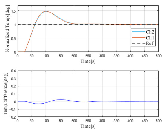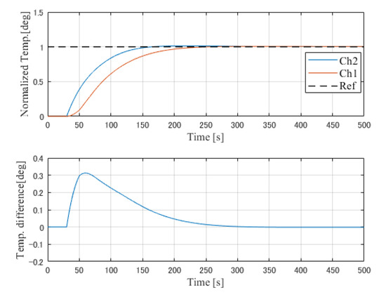 To verify the control efficiency of the proposed control SMBC method, a simulation was carried out in the MATLAB/SIMULINK environment with the controlled objects described above. The results of the simulation focused on the transient response and the temperature difference between the two channels. Control efficiency was verified by comparison with the conventional PI and gradient control methods. In simulation, the controllers C and C were calculated as (5) and (6), respectively. Hence, one of the most important factors is the stability of the controller, and there have already existed several methods for controller stability analysis [26,27], however, as the PID controller in this proposed system is designed based on the Ziegler–Nichols method (step response tuning method), the stability has been ensured [28]. The parameters K, T, and T are decided by the plant parameters K, T, and L which have already been defined.