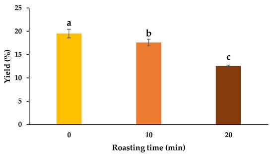 Mixed solvents, such as water and organic solvents, are commonly used to extract plant phenolics in various studies. However, the use of organic solvents will limit the application of such extracts in food processing due to safety concerns. Thus, in this study, we used water to extract water-soluble components from raw and roasted butterfly pea seeds. The yield of the aqueous extracts of raw and roasted seeds of butterfly pea is shown in Figure 1. The highest yield (19.52 ± 0.93%) was observed in the 0 min roasted seed extract, followed by the 10 min (17.59 ± 0.72%) and the 20 min roasted seed extract (12.55 ± 0.20%). The decrease in extraction yield after roasting is generally due to the occurrence of thermal denaturation of cellular components in the seeds and formation of water-insoluble materials through browning reaction [18]. Besides, excessive roasting can further lead to the breakdown of products and the reduction of volatile components [20,21].