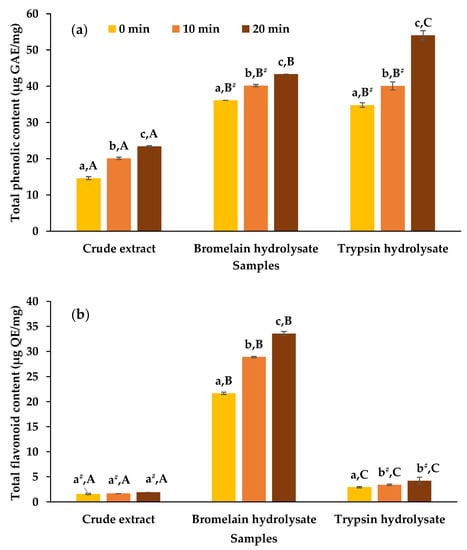 Figure 2a,b shows the TPC and TFC, respectively, in raw and roasted butterfly pea seed extracts before and after enzymatic hydrolysis using bromelain and trypsin. Non-hydrolyzed extracts showed the lowest amount of TPC (14.63–23.43 µg GAE/mg) among all samples. In contrast, both bromelain (36.11–43.33 µg GAE/mg) and trypsin (34.81–54.07 µg GAE/mg) hydrolysates showed an average of two-fold increase in TPC. Similarly, the non-hydrolyzed extracts had the lowest amount of TFC (1.59–1.90 µg QE/mg) among all samples. In contrast, bromelain hydrolysis increased the TFC up to about 18-fold, with the highest (33.57 ± 0.41 µg QE/mg) found in 20 min roasted seed extract. Although slight increase of TFC in trypsin hydrolysates was detected, it was significantly (p < 0.05) lower than that in the bromelain hydrolysates. To our knowledge, no previous studies have documented a connection between protease treatments and the additional release of phytochemicals from butterfly pea seeds.