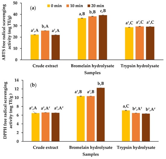 Both ABTS and DPPH free radical scavenging assays showed positive correlation to the TFC in butterfly pea seed extracts, especially the bromelain hydrolysates with the highest TFC exhibited the greatest free radical scavenging activities. The results are in agreement with a similar study [4], which demonstrated that flavonoids are major phytochemicals in contributing antioxidant activity due to their free radical scavenging ability, positive reducing power, and capability of donating H-atom to peroxy radical. In addition, the potency of antioxidant activity of hydrolysates is dependent on the duration of hydrolysis and the enzyme specificity. It has been reported that lower molecular weight hydrolysates (1000–3000 Da) may result in higher functional properties, such as scavenging activity and antibacterial activity, compared to those with high molecular weight hydrolysates [12,33]. Since water was used as a medium for extraction in the present study, soluble proteins and their conjugates were the targets for bromelain and trypsin. A similar study [34] on enzymatic hydrolysis of rice (Oryza sativa L.) extracts reported that the bromelain hydrolysates showed higher ABTS free radical scavenging activities than the non-hydrolyzed extract. Moreover, different yield of soluble peptides, amino acids, especially aromatic phenylalanine and tyrosine, and other phytochemical-conjugates obtained by using different proteolytic enzymes resulted in varying biological, chemical, and functional properties [34,35].