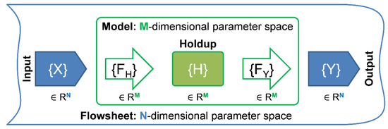 and are usually defined to be fully flexible related to the number of discrete classes () for each property coordinate. Moreover, to make the simulation system generally applicable, the number of the property coordinates and their types should also be flexible. This means that the final set of parameters may not be known during model development. However, if the model is designed applying the explicit approach, the number of considered distributed properties is always fixed. That means that for the general case the model functions , , and the holdups are defined in the -dimensional parameter space. Since the output distribution is calculated based on the internal states and the model functions , it will also be defined in the –parameter space: