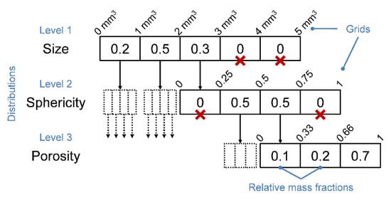 Bulk materials typically consist of individual non-uniform particles having different parameters, which vary in a certain range. These parameters are referred to as distributed and include, for example, the diameters of particles, their densities, or porosities. Although these parameters can physically be fairly accurately described by continuous distribution functions, such a representation is not always convenient for numerical analysis and modelling. Therefore, in practice, the continuously distributed material parameter space is discretized into shorter intervals, usually called classes. Each class is assigned a quantity of material, whose parameters fall into this particular interval. In this case, the distribution of the parameter of the entire material in this class is narrowed down from a continuous distribution function to a single value, for example, the average value of this class. Thus, it is assumed that all the particles inside have the same value of the parameter. Therefore, a simulation system can operate using a finite number of parameter values, which (if the number of classes is sufficient) accurately describe the original distribution.