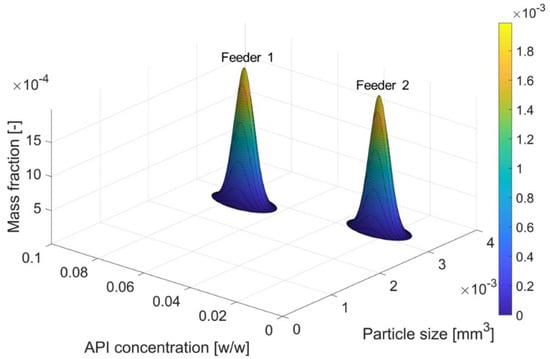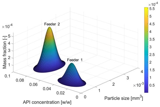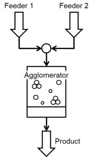 Nowadays, flowsheet simulation software is commonly used to aid with design, planning, optimization, and testing in chemical engineering []. Usually it can help with the minimization of operation costs, troubleshooting, increasing throughput and product quality, and generally provides a better understanding of the process. However, despite the fact that flowsheet simulation of fluid processes has already been state of the art for many decades [], generally applicable systems for modelling granular materials began to appear only recently and are now being actively developed. This arises from the complexity of description and handling of the solid phase. In contrast to fluids, it requires treatment of distributed parameters, such as particle size, internal porosity or moisture content. Moreover, these distributions can be interrelated, which requires even more advanced methods to treat them properly and preserve their interconnection during the simulation.