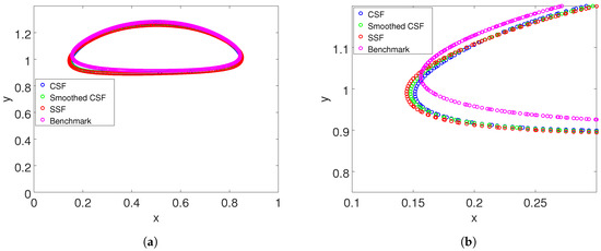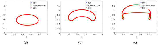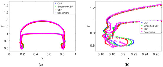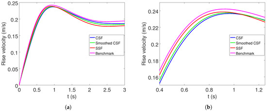 The other test case, TC2, corresponds to a case where the surface tension effects are lower [55]. This results in larger deformation of interface as the bubble evolves (see Figure 4) and eventually forms a skirted bubble that has thin filaments that breaks down into smaller droplets (see Figure 5). Comparing the surface tension models to the benchmark for final bubble shape shows that the models agree quite well (see Figure 5) but there is a difference between the models with respect to the prediction of the skirted part of the bubble (see Figure 5b). Figure 6 shows that the surface tension models in comparison to the benchmark data under-predicts the rise velocity. Comparing with the benchmark, the SSF model provides the closest agreement for (absolute error is nearly 3.5% [54] and less than 0.1% for [55]) and (absolute error is nearly 3–3.5% for both [54,55]) (see Table 7). On the other hand, CSF model agrees with the benchmarking data for (absolute error is nearly 5.7% [54] and 0% for [55]) and (absolute error is nearly 0.6% for both [54,55]) (see Table 7).