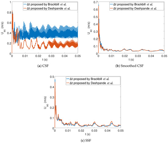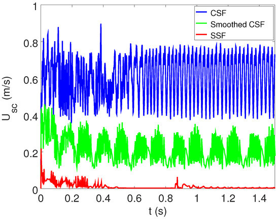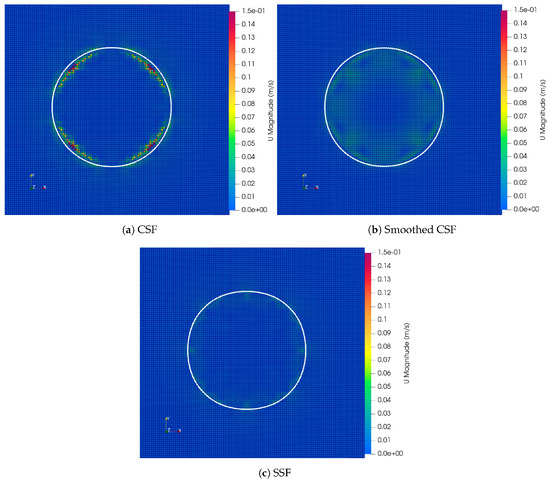 In the previous work by Klostermann et al. [55], the spurious currents were reported to be the reason for the error between the benchmark ([54]) and their simulations (for both TC1 and TC2). Thus, the differences in the predictions, for the rising bubble simulations, between the three surface tension models considered in this paper and their departure from the benchmark can also be attributed to spurious currents generated by these models (which is discussed below). For TC2, the larger variation between the surface tension models after the first peak in the transient evolution of the rise velocity (see Figure 6) can be attributed to the differences in the shapes of filament or satellite droplets (based on the work of Yamamoto et al. [36]). Interestingly, there are also some differences in the predictions by the CSF model (for both TC1 and TC2) and the data reported by Klostermann et al. [55], which could be attributed to the difference in the solver settings (e.g., the discretisation schemes, linear solvers and number of iterations) and/or the variations within the different versions of OpenFOAM. The influence of the discretisation schemes on the predicting the flow variables has been previously investigated in [88,89] but further investigation into the effects of other solver settings (e.g., the choice of linear solver and number of iterations) on the solution is required to quantify its effect. As OpenFOAM gets updated, some of the functionalities and/or the algorithms are modified, for example, the artificial interface compression term used in advection of (defined in Equation (9)) is computed differently in the older versions of the software (see [55]). To the best knowledge of the authors, no study has reported a comparison of the performance of various versions of OpenFOAM for specific flow scenarios. These settings, especially discretisation schemes and interface compression algorithms, would effect the generation and evolution of spurious currents, which could be the potential source of the discrepancy between our simulations and the data reported in literature.