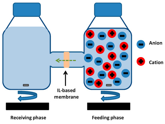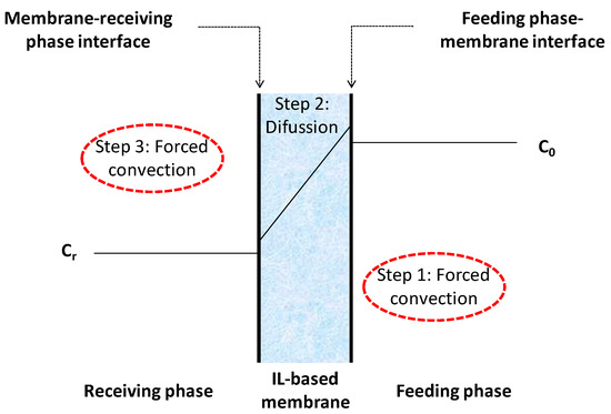 The transport of the nutrients through the IL-based membranes was analyzed in terms of permeability. The average permeability () was calculated from the slope of Equation (1), which was derived from the application of the solution-diffusion model (see Figure 2) to the transport of nutrients through PILIMs [18].