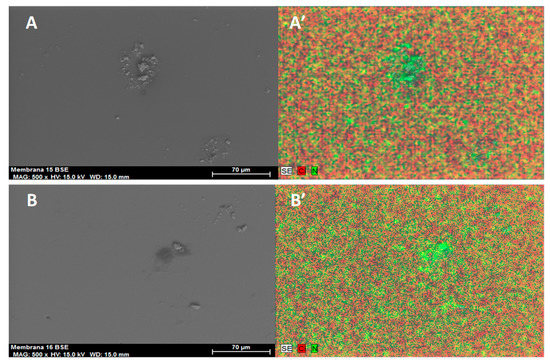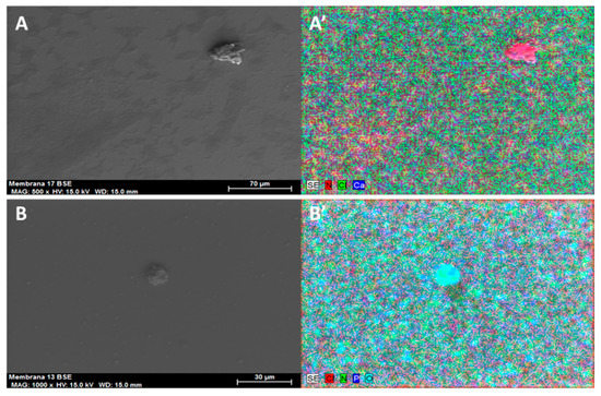 SEM of membranes containing 30% w/w of IL after being used as separators for each feeding solution: CaCl2 (A) and Na2HPO4 (B), and elemental mapping: CaCl2 (A’) and Na2HPO4 (B’).