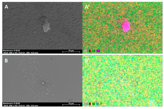 SEM and elemental mapping of membranes containing 70% w/w of IL (A,A’) and membranes containing 30% w/w of IL (B,B’) before being used.