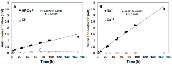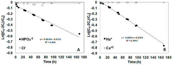 The permeability of CaCl2 and Na2HPO4 through polymer inclusion membranes, based on [MTOA+][Cl−], was determined. The experimental concentration of the anions and cations in the feeding and receiving phases as a function of the time was monitored, and the permeability of the species was calculated by using the concentrations in the receiving phase (see Figure 9). In this way, the permeability values were calculated from the slopes of the plot of ln[(C0−2Cr)/C0] for each compound versus time using Equation (1). As an example, Figure 10 shows the plots used to calculate the permeability of each compound through the membrane based on 70% w/w of [MTOA+][Cl−]. Neither Figure 9 nor Figure 10 indicate the correlation coefficients of Ca+2 and Cl− due to the very low values of permeability exhibited by both ions through the membranes studied. Moreover, in the case of the Cl−, the possible release of IL from the membrane could also affect the application of the model selected to the ions’ concentration found. The permeability values for each compound through the different PILIMs are shown in Table 2.