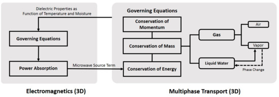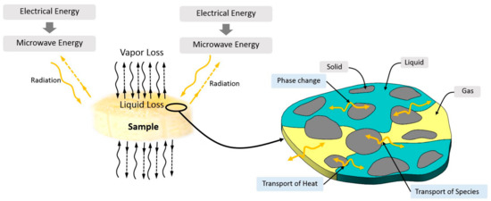 However, in recent years, the idea of multiphase porous media has gained the interest of researchers; many researchers such as Ni et al. [30], Rakesh et al. [31], Kumar et al. [32], Ratanadecho et al. [33], and Zhang et al. [34] have devoted their research to multiphase porous medium models of microwave drying. The material sample is classified as a porous medium, while the pores duly contain the three transportable phases of water vapor, air, and water in liquid form [32,35,36]. To resolve this lack of understanding, it is necessary to develop a model which can couple heat and mass transfer to make predictions for the distribution of moisture and the temperature within the material undergoing dehydration [32].