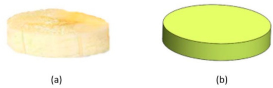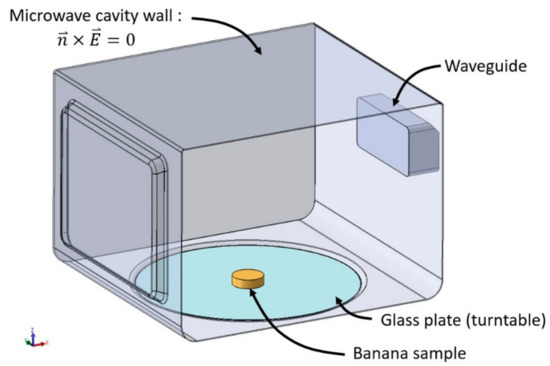 The geometric model of the microwave system used in this study was developed based on the real structure and size of the domestic 800 microwave oven that was used in the experimental procedures. It was composed of an oven cavity, waveguide, and turntable (glass plate), as shown in Figure 2, and the dimensions are given in Table 1. The excitation for the microwave oven is through a rectangular waveguide. At an excitation frequency of 2.45 , the mode is the only propagation mode [41]. The geometry of the banana samples was generated into a transversal shape, as shown in Figure 3, and the dimensions of banana samples are given in Table 1.