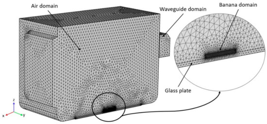 To achieve a good prediction accuracy and reduced computational time, the geometric models require an appropriate mesh size for the domains. Tetrahedral elements were assigned to the domains, including the oven cavity, waveguide, turntable, banana sample and air in the oven cavity. The main research objective of this paper is to investigate the heat distribution of the banana; therefore, extremely fine mesh refinement levels were enforced for the banana sample, while fine mesh refinement levels were selected for the other domains. The computational domain for the heat distribution was used for the banana sample only. Figure 4 shows the meshing scheme of the microwave oven and the banana sample.