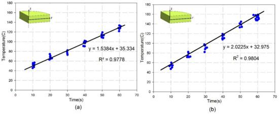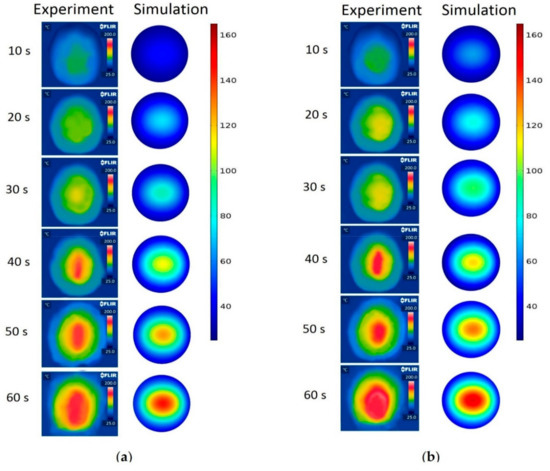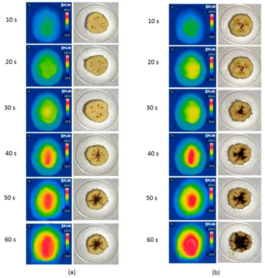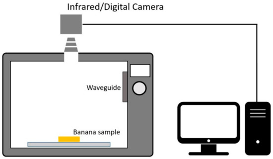 Bananas (Musa sapientum Linn.) that had similar characteristics with no evidence of mechanical damage were purchased from a local market. The bananas were classified according to a peel color index, CSIRO [50]. Samples at different ripening stages (e.g., unripe bananas (stage 1) and ripe bananas (stage 6)), were selected as samples for this study. The initial moisture contents of the unripe and ripe bananas were estimated to be approximately 45 and 65, respectively. The banana samples from each ripening stage were peeled and sliced into a transversal shape, with dimensions as shown in Table 1. A sample was placed on the center of the turntable plate inside the microwave oven cavity. Heating was performed in a microwave oven using the maximum level at 800 for 60 , and the dehydration temperatures were monitored and recorded using a thermal imaging camera (FLIR E40, FLIR Systems, Inc., USA, 320 × 240 pixels, thermal sensitivity/NETD <0.07 ) at an interval of 10 . The microwave experiment setup scheme is shown in Figure 6. Each experiment was performed in triplicate in order to obtain average temperature data.